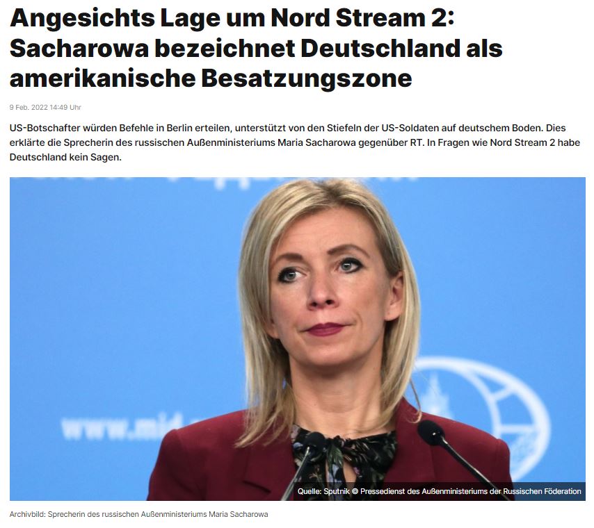 „… Vor dem Hintergrund der Spannungen um den Bau der Gasleitung Nord Stream 2 hat die Sprecherin des russischen Außenministeriums Maria Sacharowa in einem umfassenden Interview für RT die Vermutung geäußert, Deutschland befinde sich auch nach dem Ende des Kalten Krieges unter amerikanischer Besatzung. Die NATO-Verbündeten hätten ihre Souveränität an Washington übergeben und daher in Fragen wie dem Nord Stream 2-Projekt nichts zu sagen, erklärte Sacharowa.