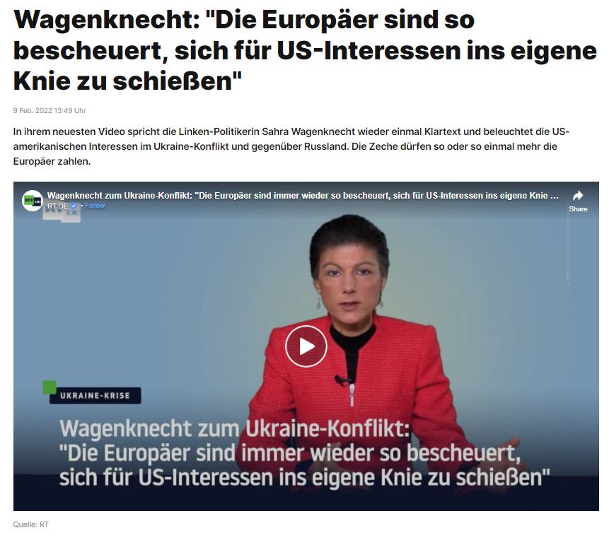 „… In ihrer Analyse kommt sie zu dem Ergebnis, dass die EU „mal wieder“ ihre eigenen Interessen zugunsten von US-Interessen hintanstelle. Während die EU in den vergangenen Jahren zahlreiche Sanktionen gegen Russland erlassen und sich damit „selbst ins Knie“ geschossen habe, floriere zum Beispiel der Ölhandel zwischen den USA und Russland. Zeitgleich fordere die US-amerikanische Regierung von der EU, das russisch-europäische Gasprojekt Nord Stream 2 einzustellen und teureres und umweltschädliches Fracking-Gas aus den USA zu kaufen. Anstatt auf Moskaus Sicherheitsbedenken angesichts der militärischen NATO-Allianz bis an Russlands Grenzen heran einzugehen und sie anzuerkennen, indem man etwa von einem NATO-Beitritt der Ukraine absieht, setze man auf Truppenaufstockung an den russischen Grenzen und Androhung von weiteren Sanktionen. Dabei sei es doch auch das eigentliche Interesse der EU, auf dem Kontinent Frieden und Zusammenarbeit walten zu lassen, anstatt einen Krieg zu riskieren. Wagenknecht fragt deshalb: „Wer profitiert eigentlich davon?“ …“