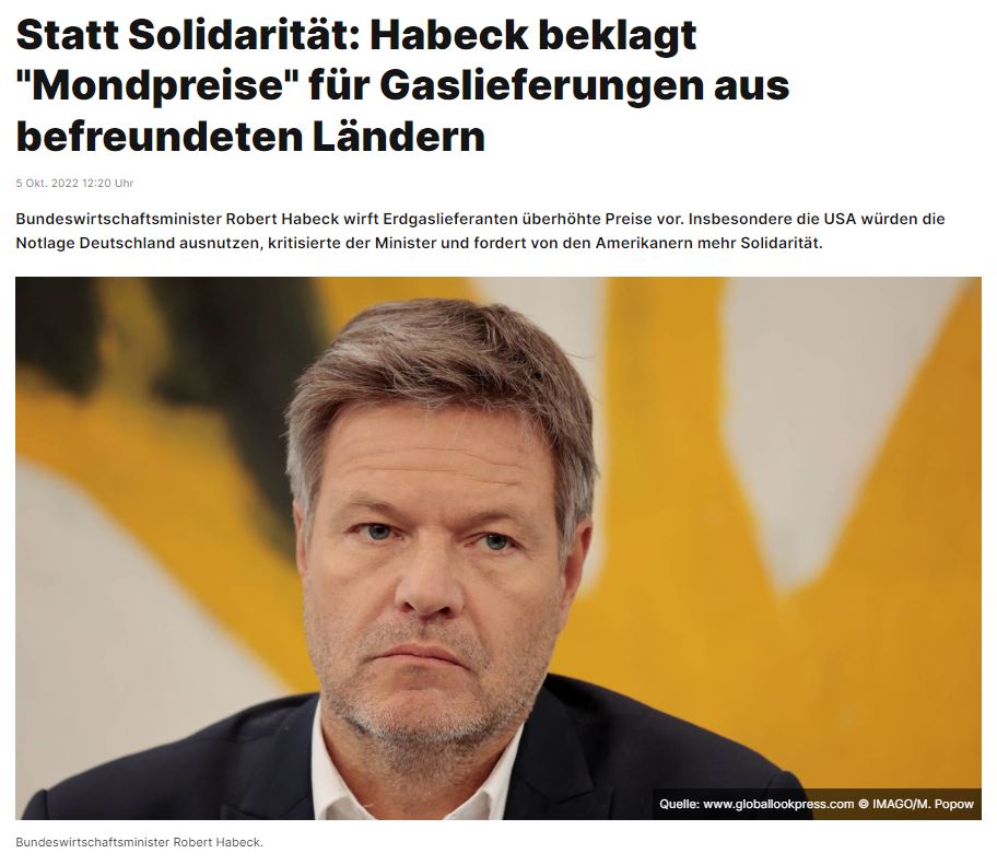 Seit Anfang September liefert Russland kein Gas mehr nach Deutschland. Schon zuvor führten die vom Westen gegen Russland verhängten Sanktionen zu einer schrittweisen Reduktion russischer Gaslieferungen. Um die im Winter drohende Gasmangellage abzuwenden, ist Deutschland nun auf andere ausländische Gaslieferanten – wie die USA – angewiesen, die den Energieträger jedoch zu horrenden Preisen vertreiben. Angesichts des hohen Bezugspreises hat Bundeswirtschaftsminister Robert Habeck (Bündnis 90/Die Grünen) den Anbietern vorgeworfen, Deutschland das Gas zu überhöhten Preisen zu verkaufen.