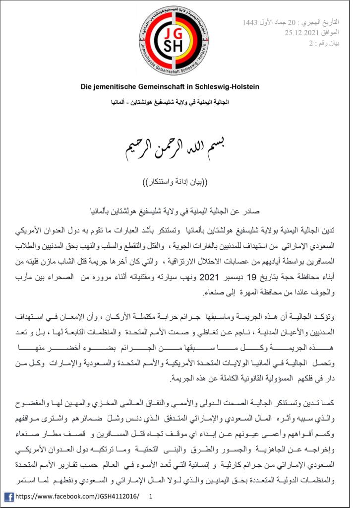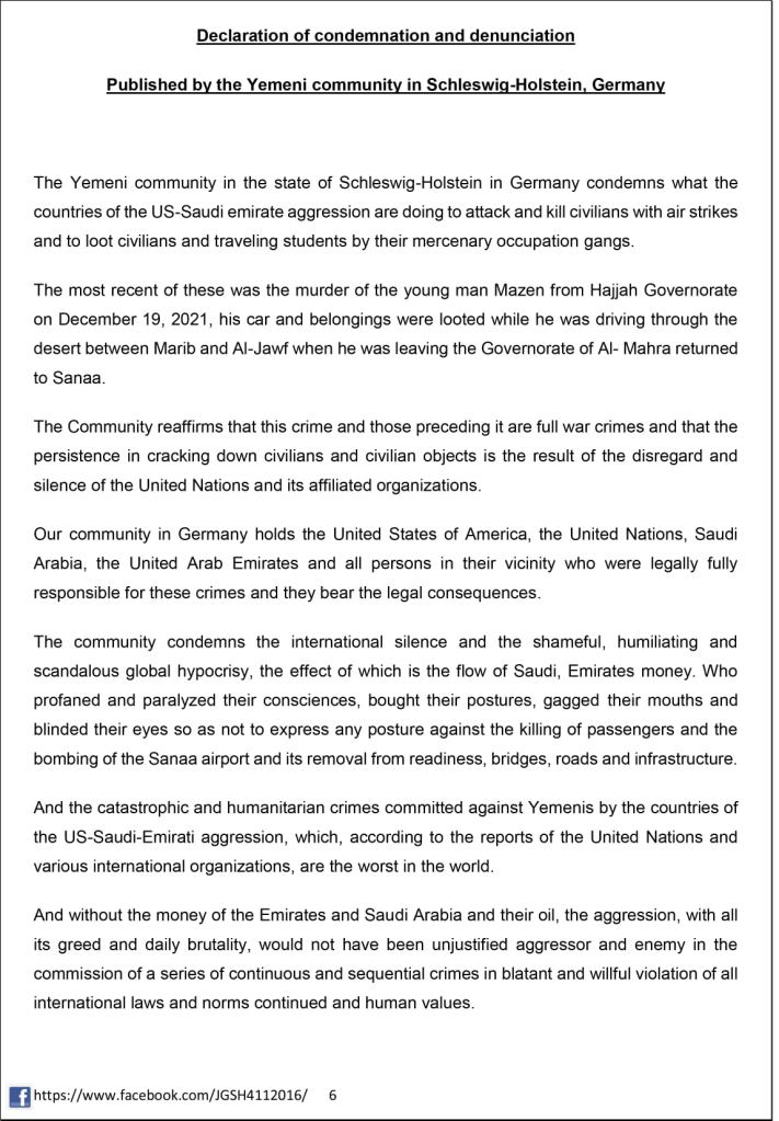 Declaration of condemnation and denunciation Published by the Yemeni community in Schleswig-Holstein, Germany (ARAB / EN)