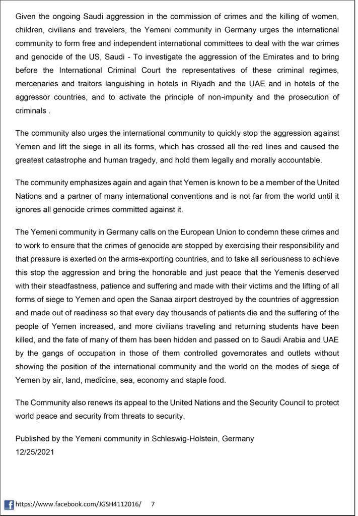 Angesichts der anhaltenden saudischen Aggression bei der Begehung von Verbrechen und der Tötung von Frauen, Kindern, Zivilisten und Reisenden fordert die jemenitische Gemeinschaft in Deutschland die internationale Gemeinschaft auf, freie und unabhängige internationale Komitees zu bilden, um die Kriegsverbrechen und den Völkermord der USA , Saudi-Emirati-Aggression zu untersuchen und die Vertreter dieser kriminellen Regime, Söldner und Verräter, die in Hotels in Riad und den VAE und in Hotels der Aggressor Länder schmachten, vor der Internationalen Strafgerichtshofs vorzustellen, und das Prinzip der Nichtstraflosigkeit aktivieren und die Verfolgung von Kriminelle.