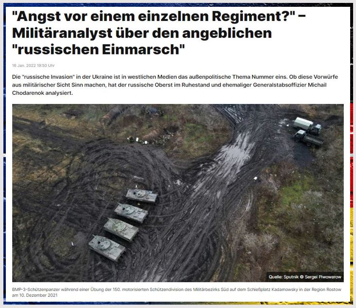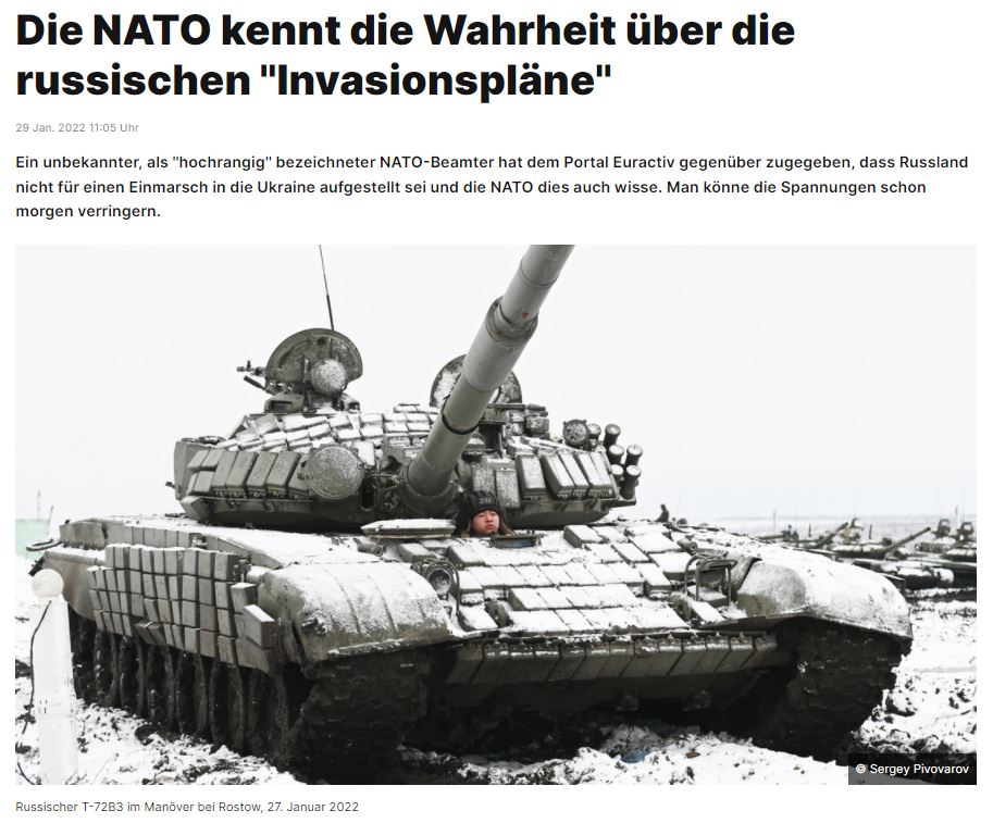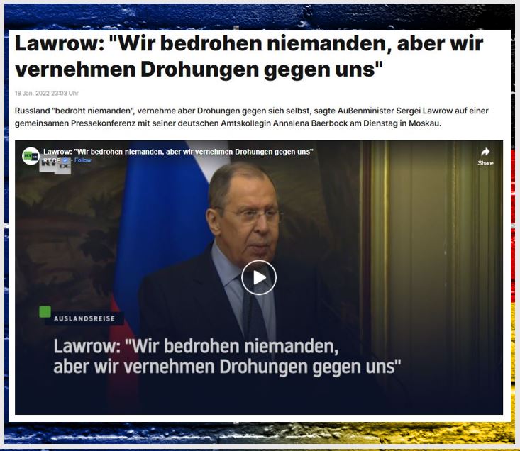 Neben den gleichgeschalteten NATO-Regierungsmedien überschlagen sich förmlich die umstrittenen Weltakteure wie: Deutschlands Bundeskanzler Olaf Scholz (SPD) und Außenministerin Annalena Baerbock (Bündnis90/Grüne) seit 08.12.2021, Jens Stoltenberg (NATO-Generalsekretär), Ursula von der Leyen (EU-Kommissionspräsidentin) bis hin zu Joe Biden (US-Präsident) darin, Moskau davor zu warnen, in die Ukraine einzumarschieren. Diese mediale Inszenierung angeblicher russischer Bedrohung der Ukraine nimmt seit Einzug von Bündnis90/Grüne auf deutscher Regierungsbank im Reichstag immer groteskere sowie gefährlichere Züge an.