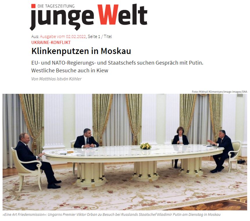 Am Dienstag den 01.02.2022 erklärte Dmitri Peskow, Sprecher des russischen Präsidenten, laut TASS, die richtige Antwort auf die Ablehnung der russischen Sicherheitsvorschläge seitens der USA und NATO werde noch vorbereitet. Am Dienstagabend 01.02.2022 fand eine gemeinsame Pressekonferenz von Wladimir Putin mit Ungarns Ministerpräsident Viktor Orban im Kreml statt. Dabei sagte Putin, dass der Westen auf das Prinzip der „Unteilbarkeit der Sicherheit“ in Europa keine Rücksicht nehme. Russlands Forderung nach einem Ende der NATO-Osterweiterung sei abgelehnt worden, kritisierte er.