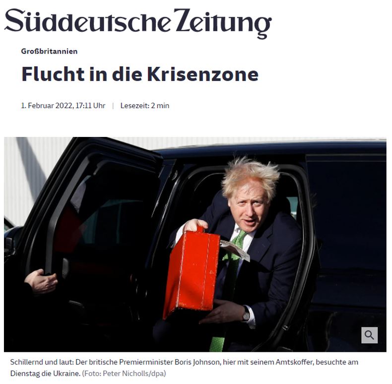 Stefan Kornelius: „Am Dienstag traf Johnson mit dem ukrainischen Präsidenten Wolodimir Selenskij in Kiew zusammen. Dritter im Bunde war Polens Premier Mateusz Morawiecki. Die Botschaft der koordinierten Besuche war klar: Hier kommen die treuesten Unterstützer des Landes, die anders als Frankreich oder Deutschland auch Waffen liefern.“