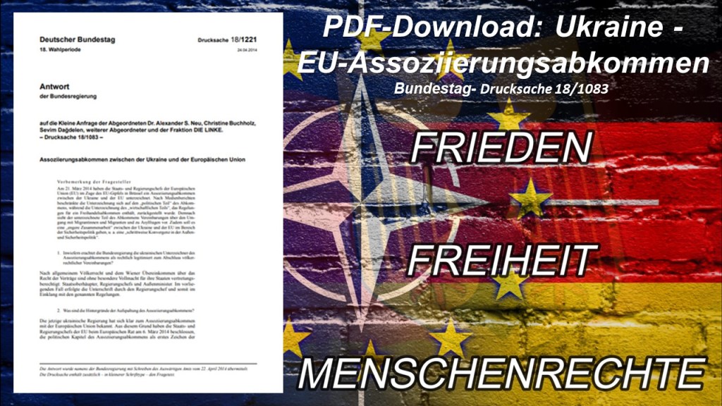Am 21. März 2014 haben die Staats- und Regierungschefs der Europäischen Union (EU) im Zuge des EU-Gipfels in Brüssel ein Assoziierungsabkommen zwischen der Ukraine und der EU unterzeichnet. Nach Medienberichten beschränkte die Unterzeichnung sich auf den „politischen Teil“ des Abkommens, während die Unterzeichnung des „wirtschaftlichen Teils“, das Regelungen für ein Freihandelsabkommen enthält, zurückgestellt wurde. Demnach sieht der unterzeichnete Teil des Abkommens Vereinbarungen über den Umgang mit Migrantinnen und Migranten und zu Asylfragen vor. Zudem soll es eine „engere Zusammenarbeit“ zwischen der Ukraine und der EU im Bereich der Sicherheitspolitik geben, u. a. eine „schrittweise Konvergenz in der Außen- und Sicherheitspolitik“.