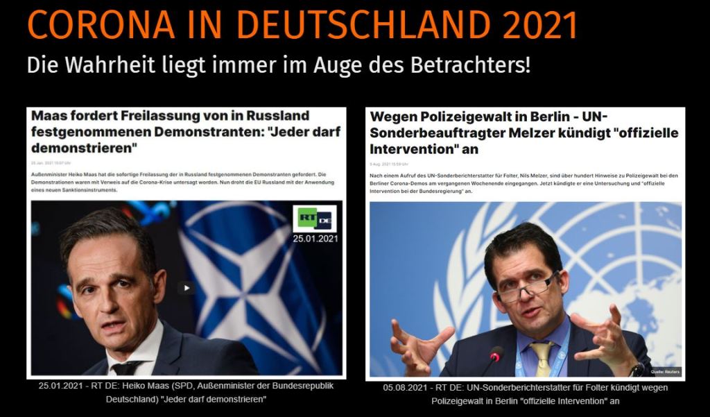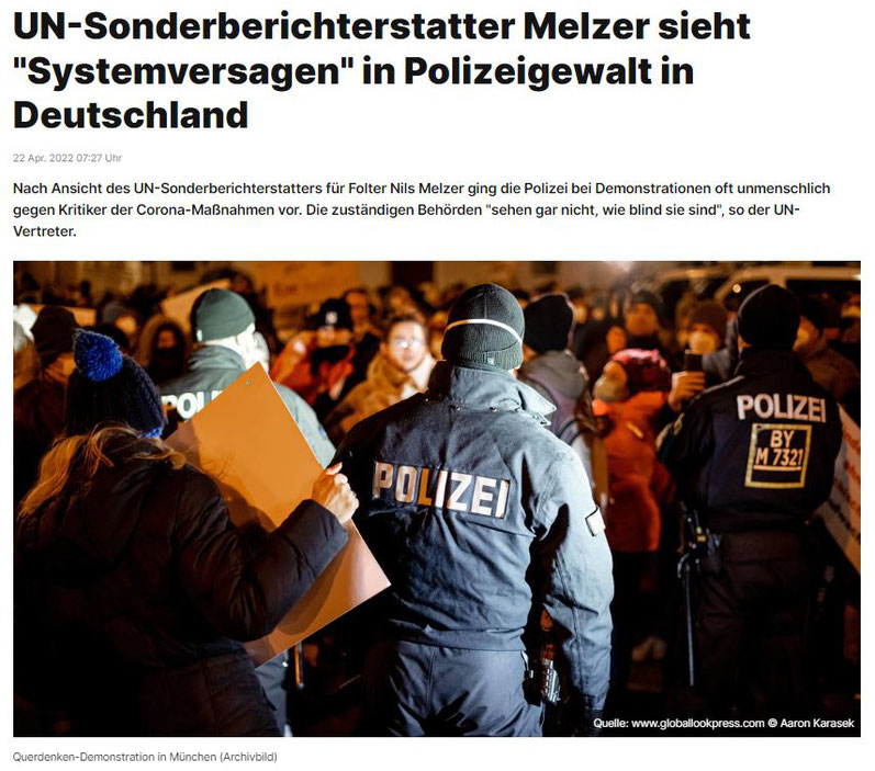 Während sich am 25.01.2021 der ehemalige Außenminister Deutschlands Heiko Maas (SPD) sich zu Protesten in Russland wie folgt äußert, „Jeder darf demonstrieren“ und die Freilassung von gefangenen Demonstranten in Russland fordert, äußert sich am 22. April 2021 der ehemalige UN-Sonderberichterstatter für Folter Nils Melzer zum Thema Polizeigewalt gegen legitime und friedliche Demonstranten in Deutschland.