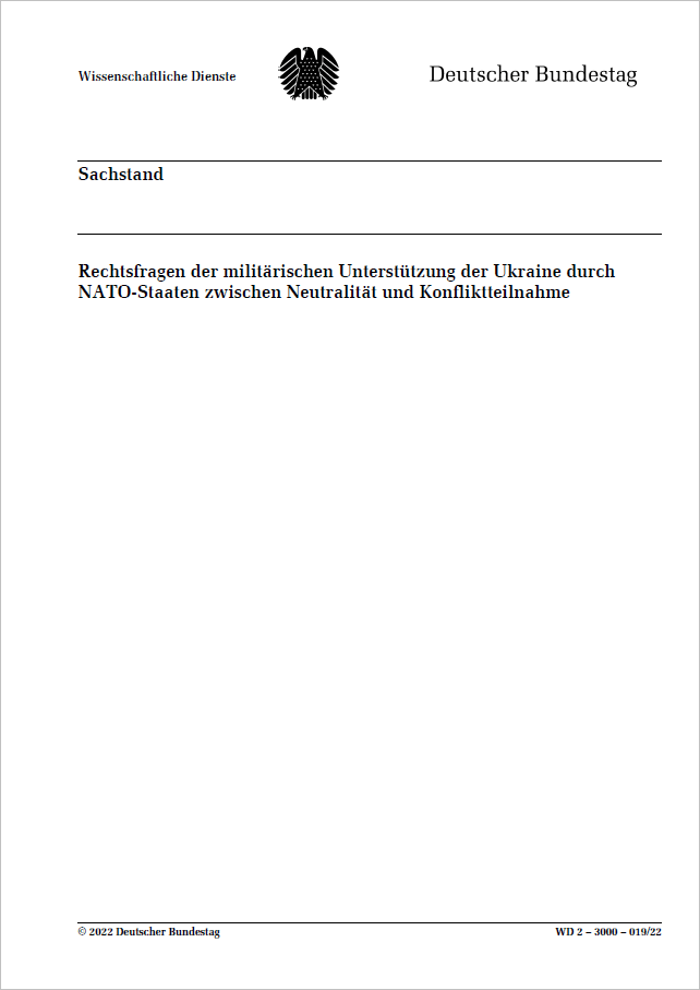 Wie der Wissenschaftliche Dienst des Bundestages bestätigt, verlässt Deutschland spätestens mit der Ausbildung ukrainischen Soldaten in Deutschland (in deutschen und/oder US-amerikanischen Militärbasen in Deutschland) den „gesicherten Bereich der Nichtkriegsführung“.