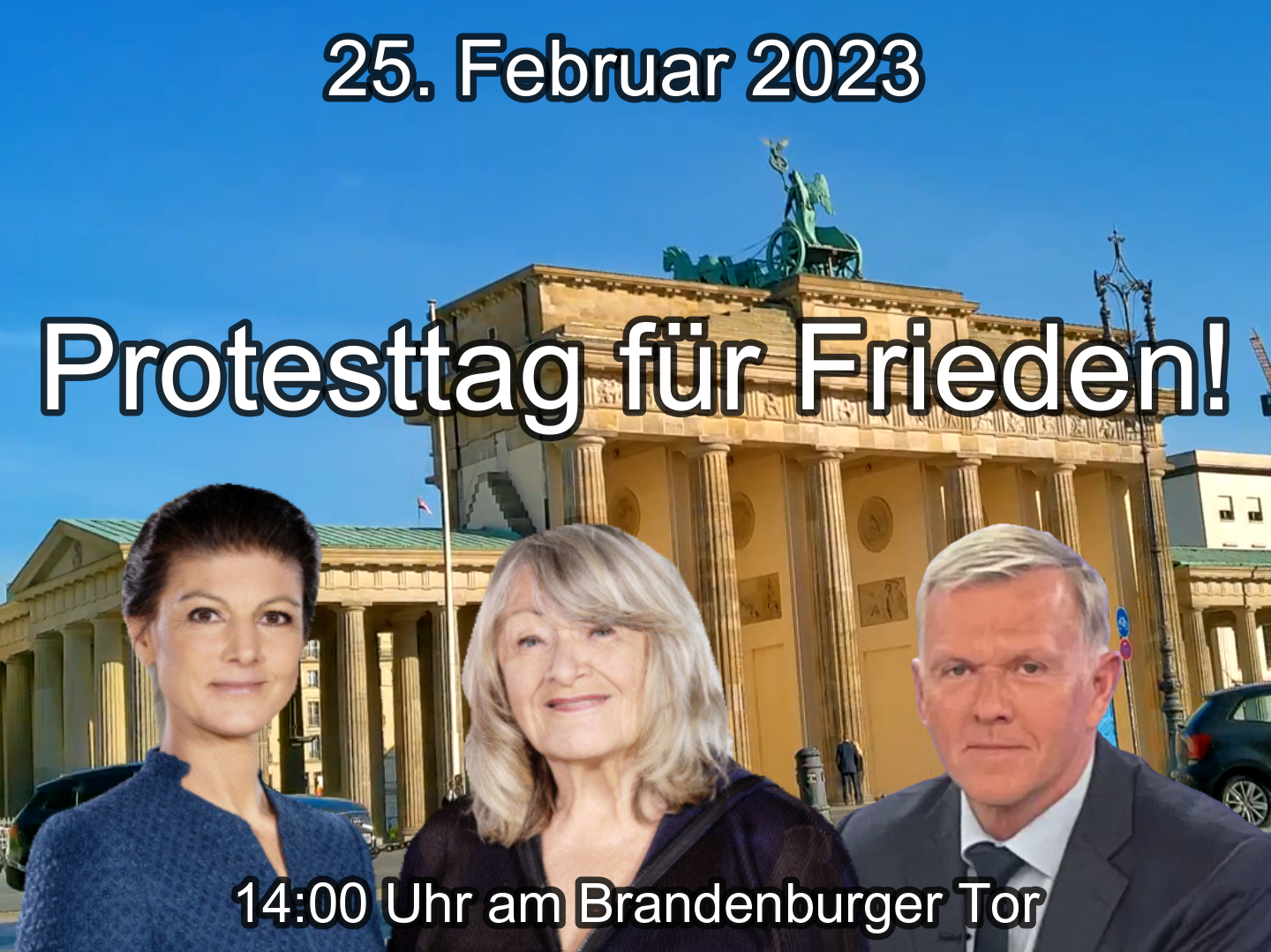 10.02.2023 – Aufruf zur Kundgebung – Manifest für Frieden! KUNDGEBUNG: Alice Schwarzer, Sahra Wagenknecht und Brigadegeneral a.D. Erich Vad haben für den 25. Februar einen Protesttag initiiert: eine Kundgebung am Brandenburger Tor in Berlin.