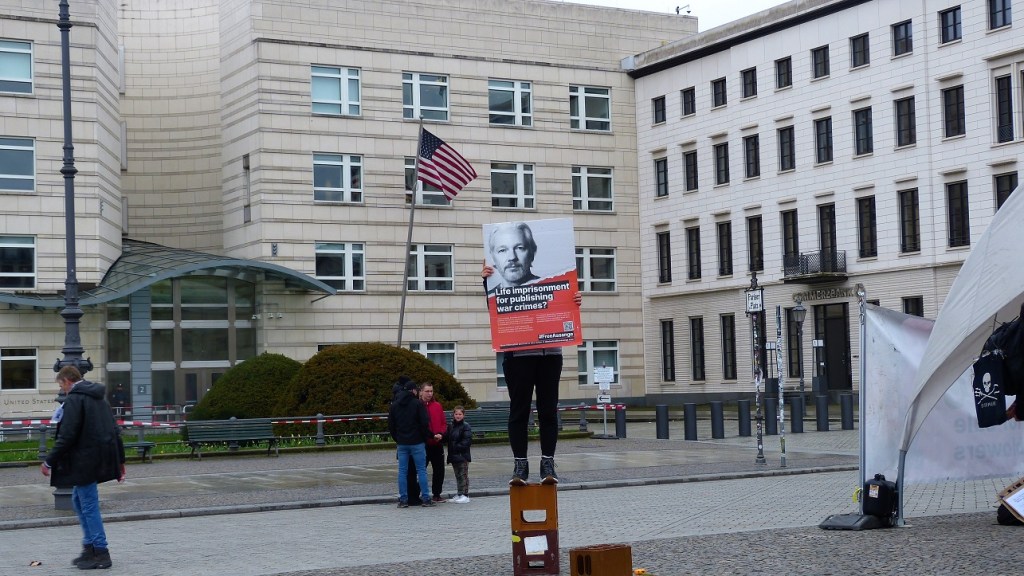 Bereits seit November 2018 zeigen Berlin-Brandenburger Menschenrechts- und Friedensaktivisten regelmäßig vor den Botschaften der USA, Frankreich, Großbritannien und den Büros der EU-Kommission bzw.- Parlament Gesicht für die Freilassung des australischen investigativen Journalisten und Verlegers Julian Assange.