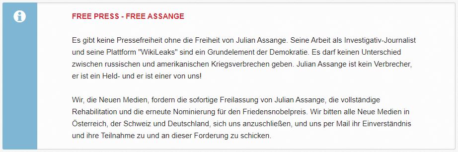 Wir rufen die Neuen Medien in Österreich, der Schweiz und Deutschland, wie beispielsweise Manova, Nachdenkseiten, Kontrafunk, Boris Reitschuster, Apolut, Auf Eins, und alle weiteren jetzt nicht genannten auf, sich der folgenden Forderung von stattzeitung.org anzuschließen. Es soll dies ein machtvolles Eintreten der Neuen Medien für die sofortige Freilassung, der vollständigen Rehabilitation- und der erneuten Nominierung für den Friedensnobelpreis von Julian Assange sein.