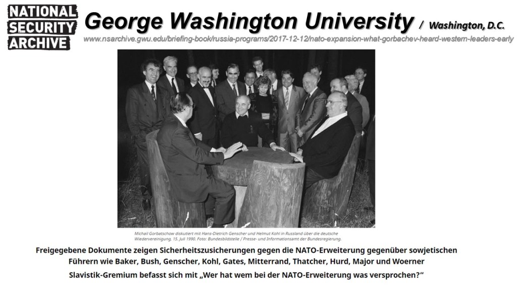 Die Ausdehnung der NATO-Staaten seit 1999 bis heute bis an Russlands Grenzen, ist eine der Hauptursachen, warum Russland sich seit Februar 2022 gezwungen sah, eine militärische Sonderoperation in der Ukraine zu starten. Diese Dokumentation widerlegt zweifelsfrei anhand von Dokumenten der George Washington University, WikiLeaks und zahlreicher weiterer Quellen, die Narrative von Vertretern NATO-naher westlicher Medien, NGOs und Politiker von Parteien bis hin zu Regierungen, die meinen, es hätte nie Abkommen mit Russland gegeben, die einer NATO-Osterweiterung zuwiderlaufen.