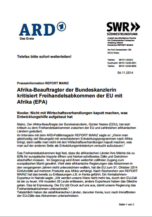 Im Interview mit dem ARD-Politikmagazin REPORT MAINZ sagte er: „Wenn man gleichzeitig viel Steuergeld mit verschiedenen Entwicklungsprogrammen nach Afrika bringt, dann sollte man nicht mit den Wirtschaftsverhandlungen kaputt machen, was man auf der anderen Seite als Entwicklungsministerium versucht aufzubauen.“