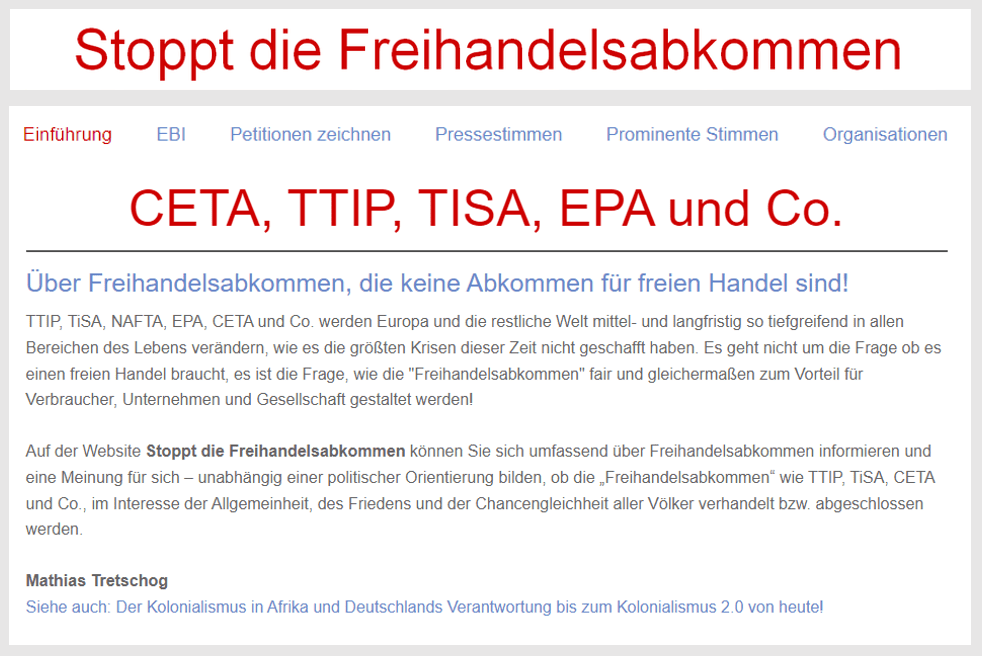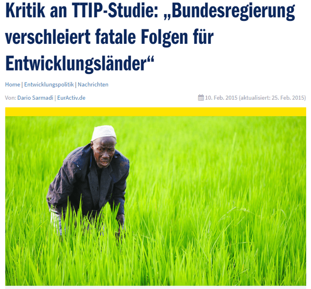 Die Verbraucherorganisation foodwatch hält nun dagegen: „Die Studie stützt sich auf utopische und unrealistische Annahmen. TTIP in der geplanten Form ist und bleibt ein Armutsprogramm für Entwicklungsländer. Wer etwas anderes behauptet, der verbreitet interessengeleitete Informationen“, so foodwatch-Sprecher Martin Rücker gegenüber EurActiv.de.“ …