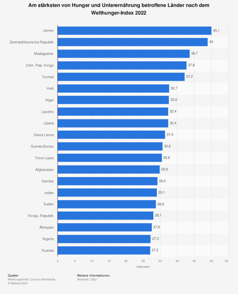 Die Statistik zeigt die am stärksten von Hunger und Unterernährung betroffenen Länder weltweit nach dem Welthunger-Index 2022. Das Land Jemen erhielt im Welthunger-Index 2022 einen Wert von 45,1 und war damit das am stärksten von Hunger betroffene Land der Welt. Die Staaten Burundi, Somalia, Südsudan und Syrien liegen in der Indexbewertung in einer ähnlichen Situation, können aufgrund fehlender Werte jedoch nicht individuell eingeordnet werden.