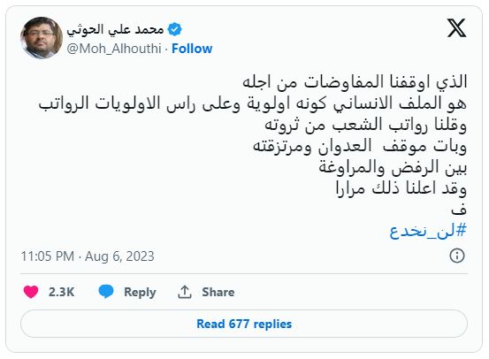 X (Twitter): Abdulmalik al-Huthi – Führer der Huthi-Bewegung (Ansarullah, Helfer Gottes): „Die Dinge, die die Verhandlungen stoppten, waren die humanitäre Lage und die Gehälter.“ Das sind die obersten Prioritäten. Die Gehälter der Menschen stammen aus ihrem Vermögen.“ Die Position der von Saudi-Arabien geführten Aggressionskoalition und ihrer Söldner war Ablehnung und Ausweichen. Das haben wir mehrfach zum Ausdruck gebracht.“