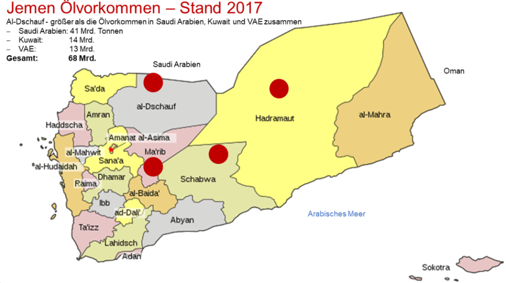Seit 2016 verweigert der saudische Kronprinz Bin Salman, die Erlöse aus den jemenitischen Ölvorkommen an Sanaa zu transferieren, das die am dichtesten besiedelten Gebiete des Landes verwaltet und 80% der jemenitischen Menschen zu versorgen hat. Die reichen Ölmonarchien Saudi Arabien und Vereinigten Arabische Emirate plünderten damit faktisch den Öl- und Gasreichtum des Landes und lassen den Jemen immer weiter verarmen und finanzieren mit jemenitischen Öl und Gas ihren Vernichtungskrieg gegen das Land, der allein Saudi Arabien jährlich 60 Milliarden US-Dollar kostet.