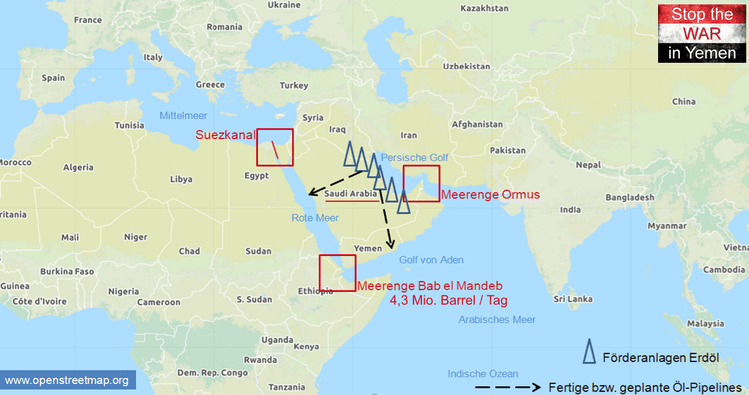 Aufgrund der geopolitischen Lage des Jemen mit seiner Meerenge Bab el Mandeb, weiterführend zum Suezkanal – durch die ca. 40% der weltweiten Öltransporte verschifft werden, brauchen die USA im Jemen hörige Marionettenregierungen in der Region, so wie sie sie in der Ukraine, der EU- und NATO-Ländern etabliert hat. Öl ist der wichtigste Treibstoff, mit dem die USA ihre ~ 800 ausländischen Militärbasen weltweit betreiben kann.