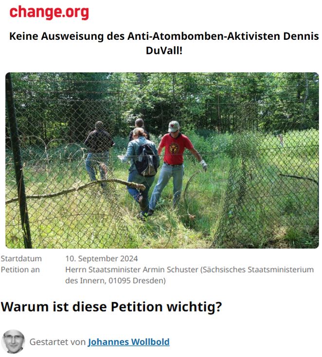Am 31. Oktober beabsichtigen Sie die Ausweisung des 82-jährigen US-Bürgers Dennis DuVall, wohnhaft in Radeberg, Deutschland, Mitglied der „Veterans For Peace“ und Atomwaffengegner gegen die auf dem NATO-Stützpunkt Büchel in Deutschland stationierten US/NATO Thermonuklearbomben.