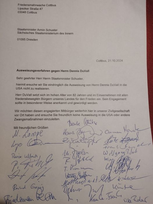 - 31.10.2024, angekündigte Ausweisung für 2 Jahre von Dennis DuVall mit der Begründung der Bautzner Ausländerbehörde, DuValls Widerstand gegen US-Atomwaffen in Deutschland stellt eine ernsthafte Bedrohung der Sicherheit und öffentlichen Ordnung dar.