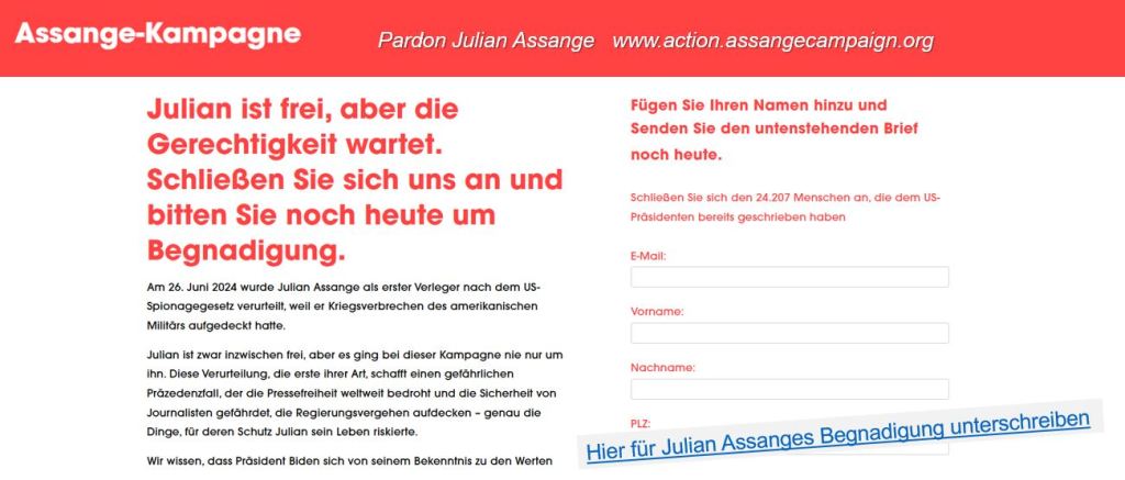 „Unser Kampf um Gerechtigkeit für Julian geht weiter. Wir drängen jetzt sowohl Präsident Biden als auch den gewählten Präsidenten Trump, Julian zu begnadigen. Das würde eine klare Botschaft aussenden, dass Journalismus kein Verbrechen ist, und es würde die Verurteilung rückgängig machen, für die Julian sich schuldig bekennen musste, um seine Freiheit zu erhalten. Deshalb ist es so wichtig, dass wir diese Begnadigung erreichen und diesen schrecklichen Präzedenzfall, der in diesem Fall geschaffen wurde, rückgängig machen. Ich fordere Sie alle auf, auf pardonassange.org zu gehen, Ihren Namen einzutragen und den offenen Brief an Präsident Biden zu unterzeichnen.“