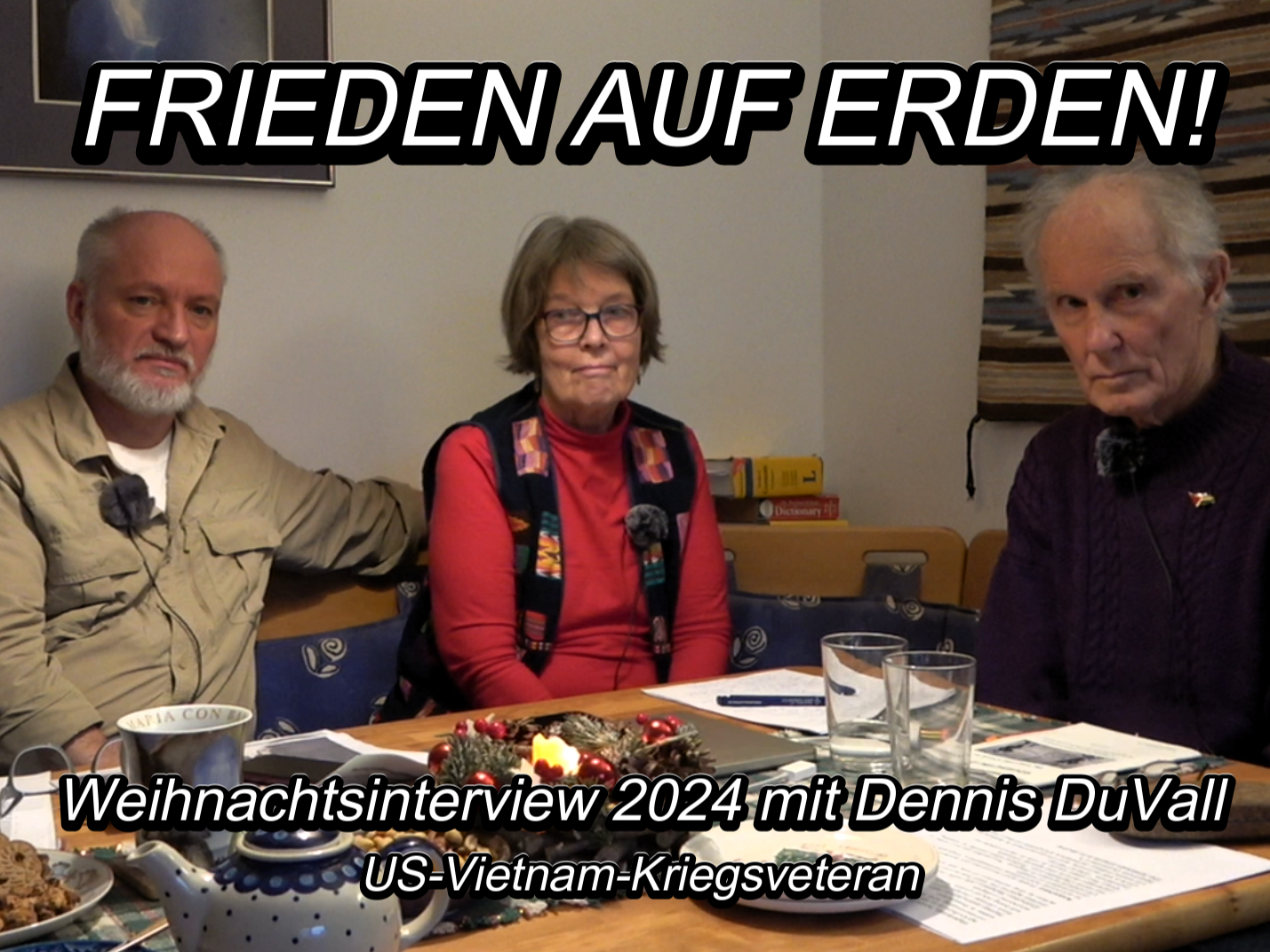 Weihnachtsinterview (D/EN) am 18.12.2024 mit Dennis DuVall (US-Vietnam-Kriegsveteran) und seiner Frau Michelle Shilow irgendwo in Sachsen: Themen: Vietnam / Afghanistan / Irak / Syrien / / Libanon / Palästina / Israel / Jemen / Westsahara / NATO / USA / Ukraine / Russland / Deutschland / Atomkrieg und seine Folgen. DENNIS DUVALL MUSS BLEIBEN! Wir … Frieden auf Erden! Ein Interview mit Dennis DuVall vor Weihnachten 2024 weiterlesen