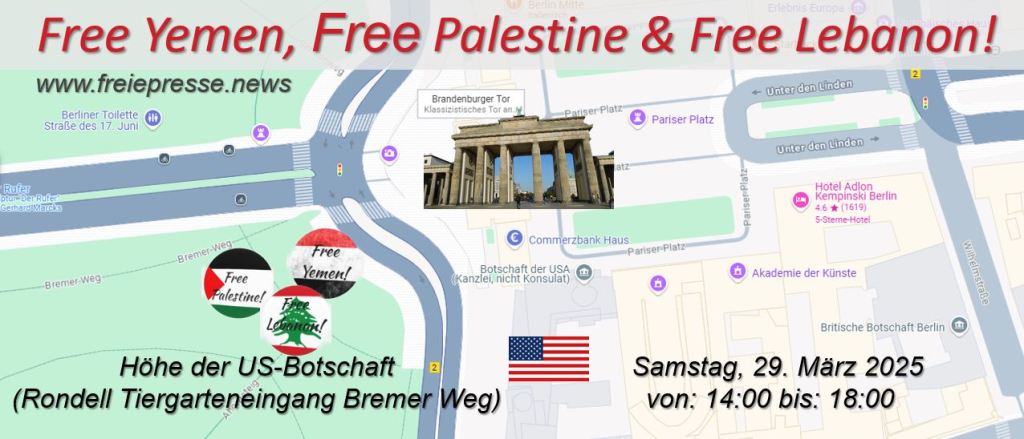 21.03.2025 – Hodhod Yemen News Agency: March 29, 2025 in Berlin – Free Yemen, Free Palestine & Free Lebanon (29. März 2025 in Berlin – Freies Jemen, Freies Palästina & Freier Libanon)