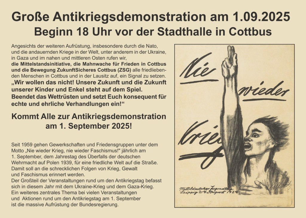 01. September 1945/2025: Friedensinitiativen aus Cottbus begehen den Antikriegstag, der die Schrecken von Krieg und Gewalt in das Gedächtnis und Bewusstsein der Menschen wieder bringen soll. Er erinnert an den Beginn des Zweiten Weltkriegs, der mit dem deutschen Überfall auf Polen am 1. September 1939 eingeleitet wurde.